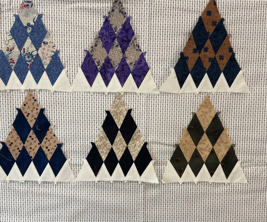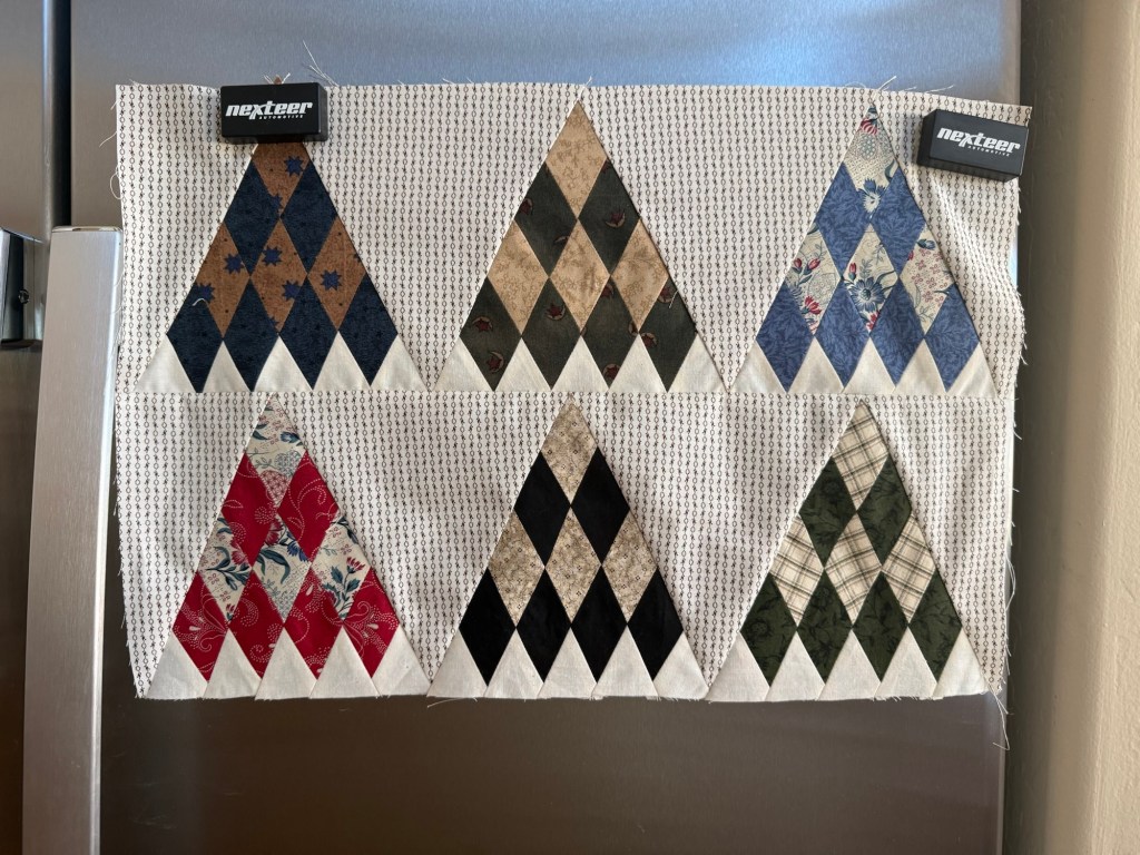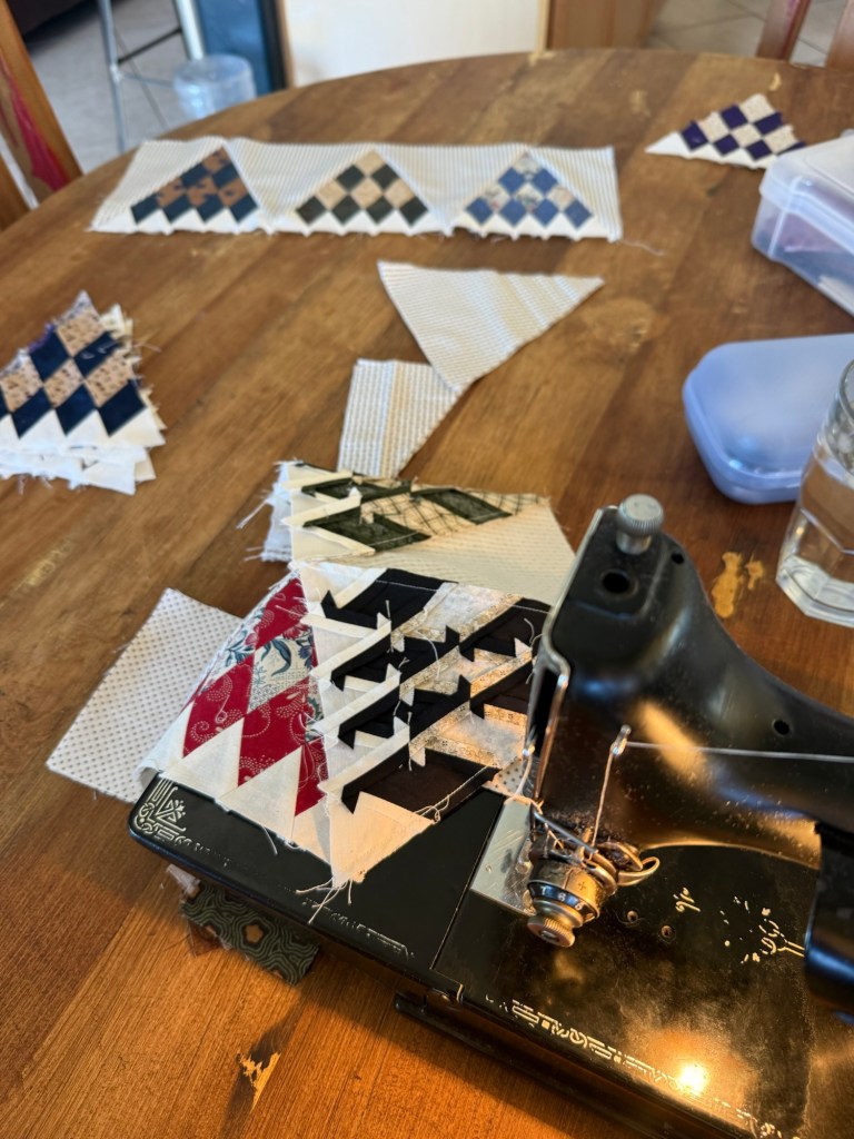 I got my triangles cut and set up at the kitchen table. I’m dog sitting and this makes it easier to keep an eye on the pups.