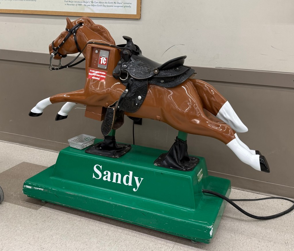 Daughter #3 is in charge of online marketing for a large Midwest grocery store chain. Every store has one of these. She loved to ride Sandy every time we went to the store when she was little! It’s fun that they still have them and now she works for the company.