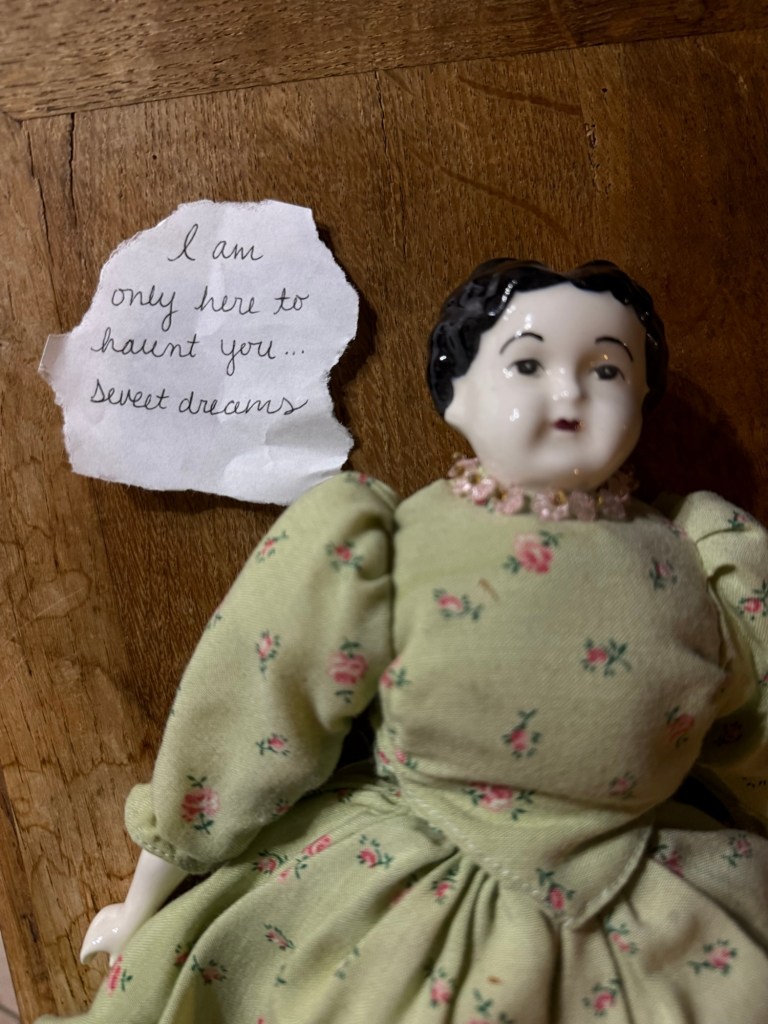 Bahahaha! It was Daughter #2. I kept it because it always made me laugh. Apparently when we moved, I had the doll and the note also packed in one of these cabinets with my little quilts.