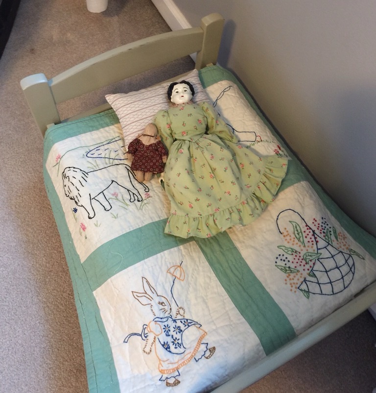 I have collected several little doll beds over the years. I like using them to display my little quilts. Years ago, I also picked up this china doll.