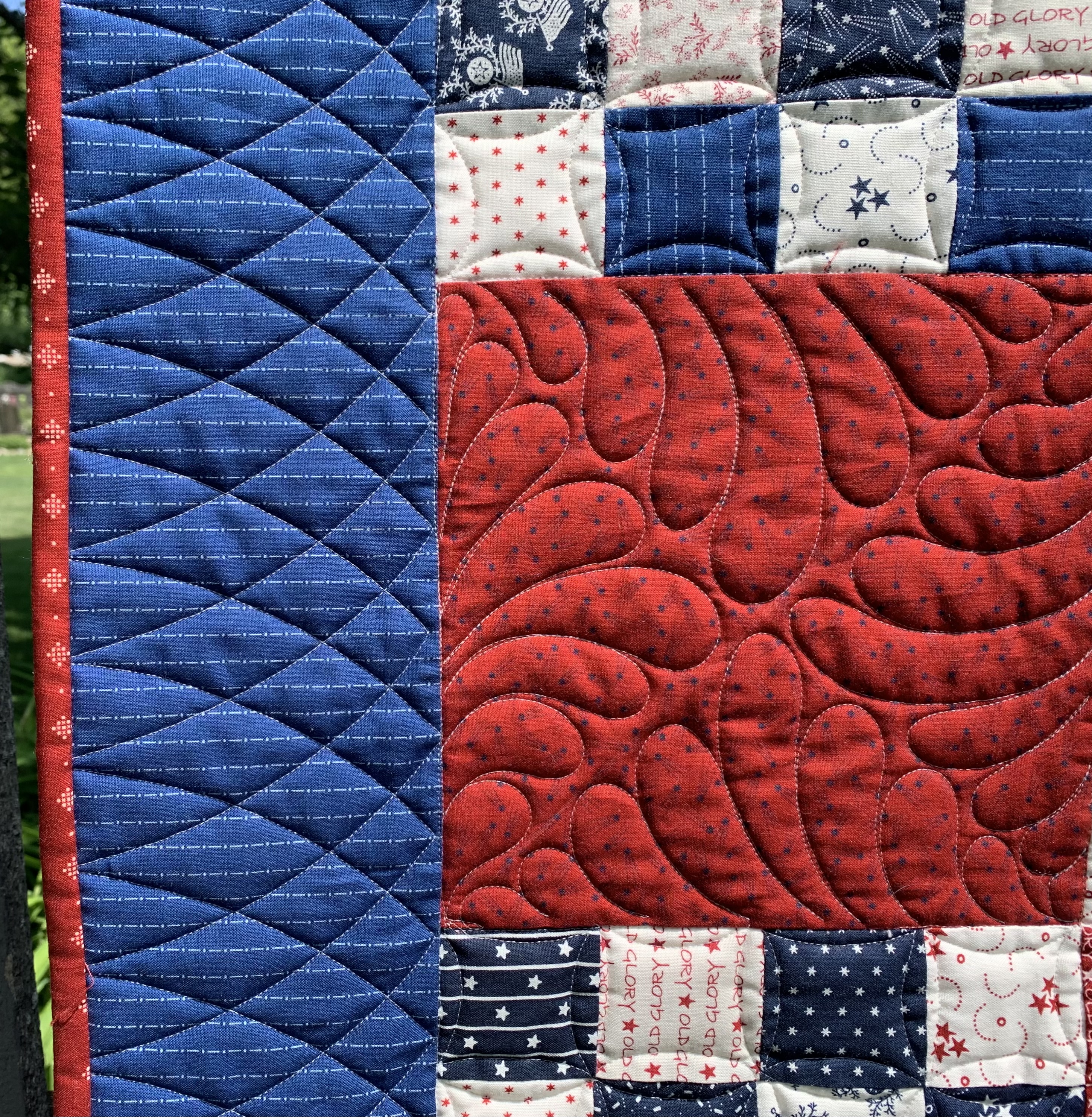 I tried a different binding treatment on this one. I stitched the binding to the back, then do,see to the front and used this decorative stitch on my old Pfaff.