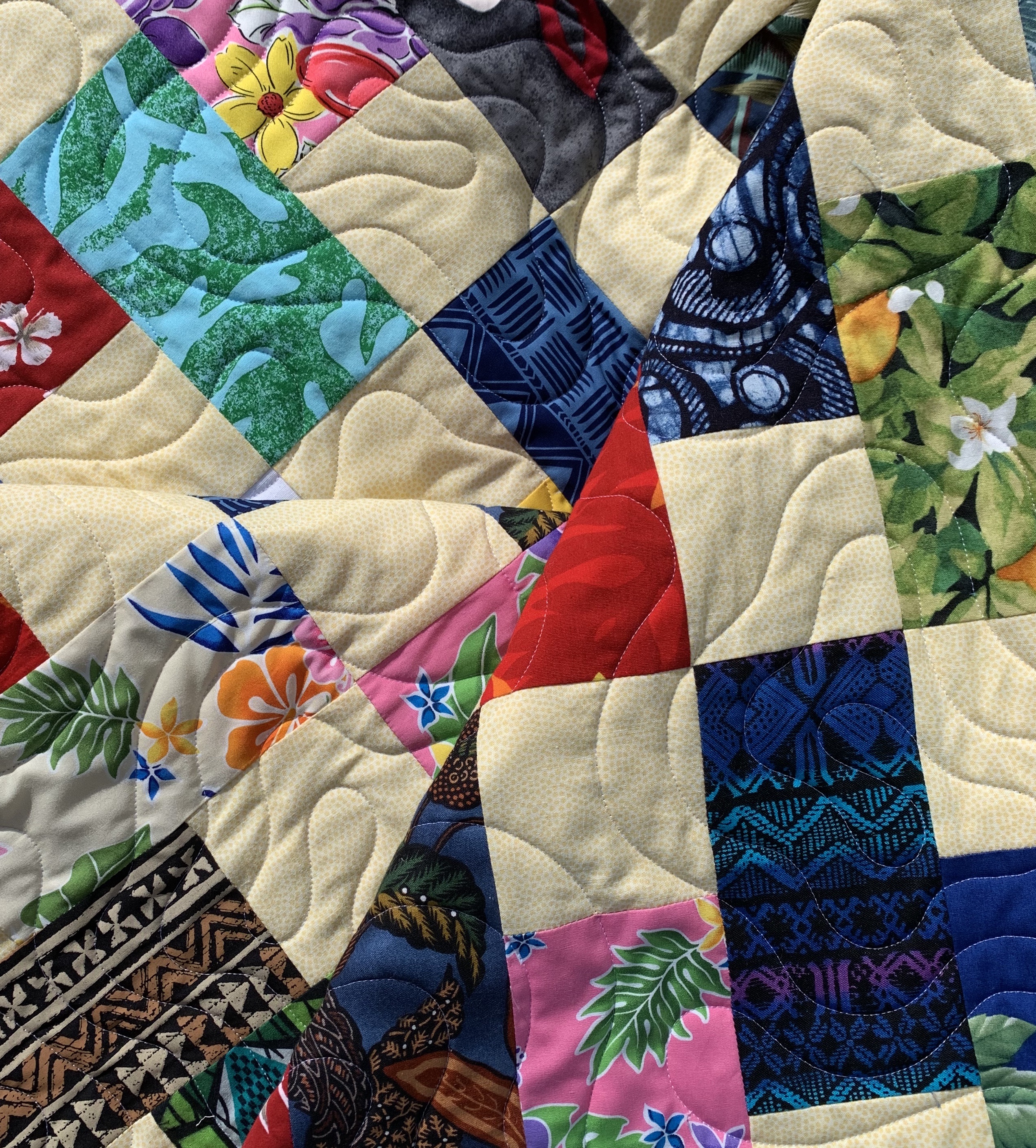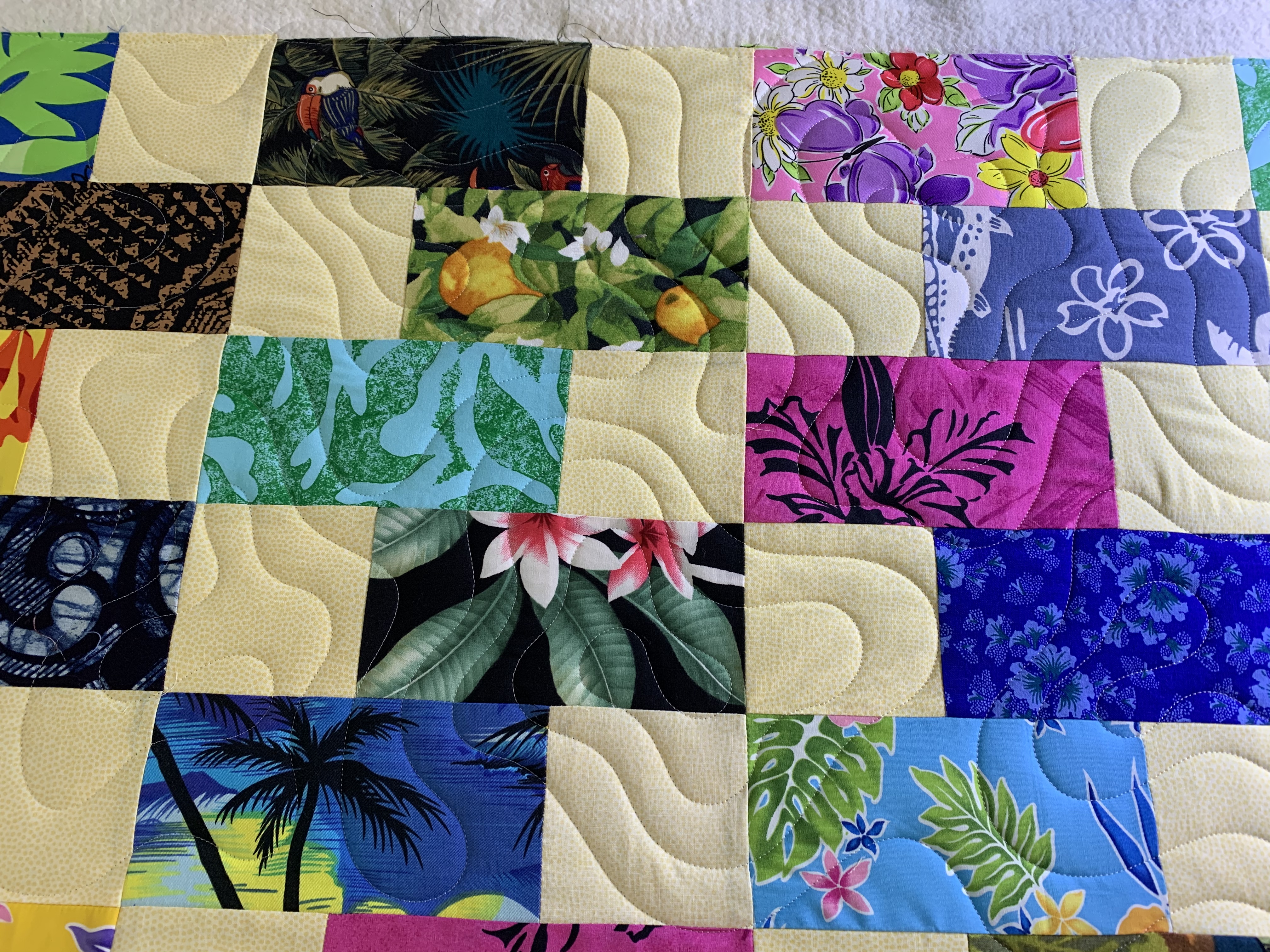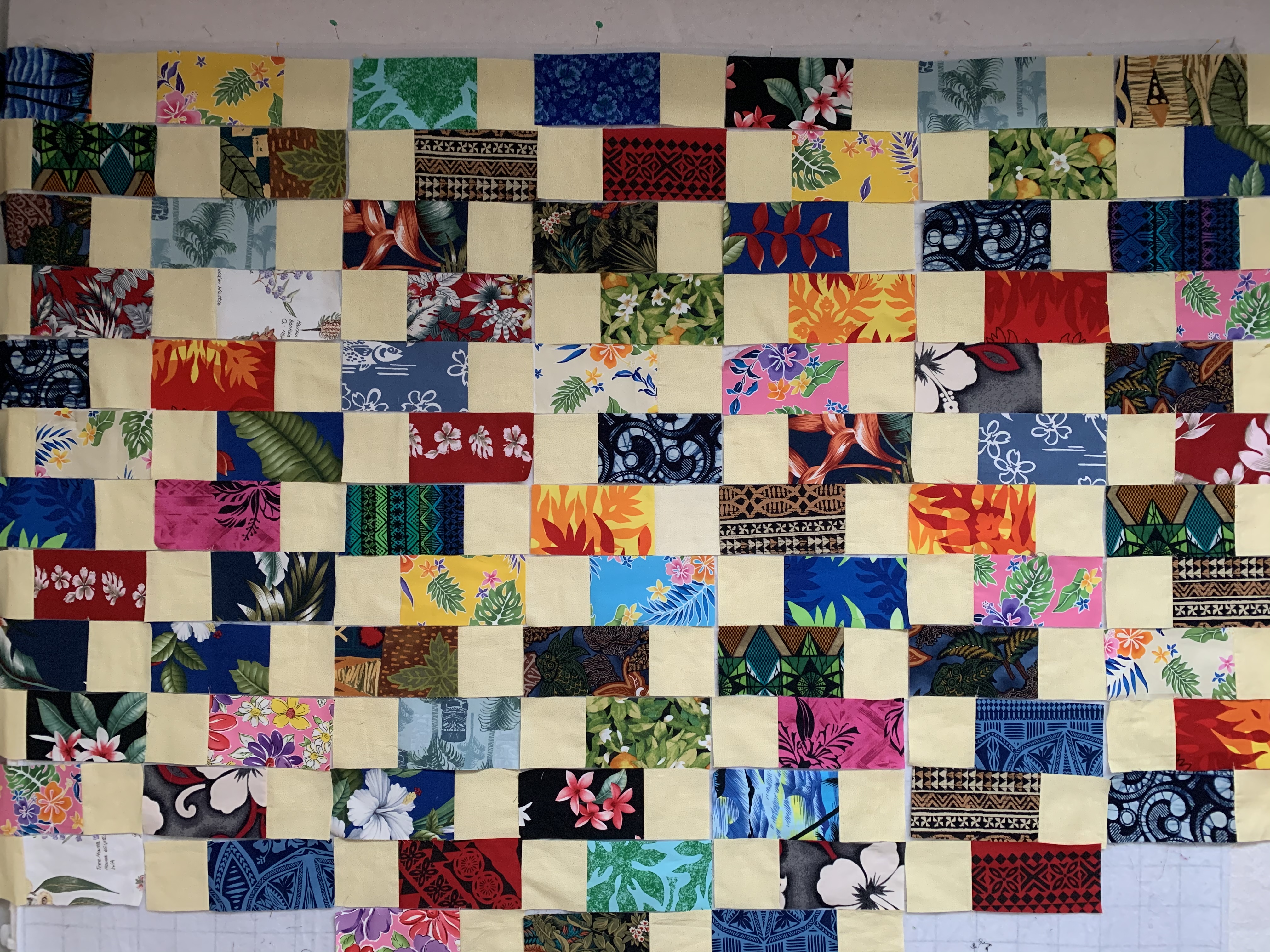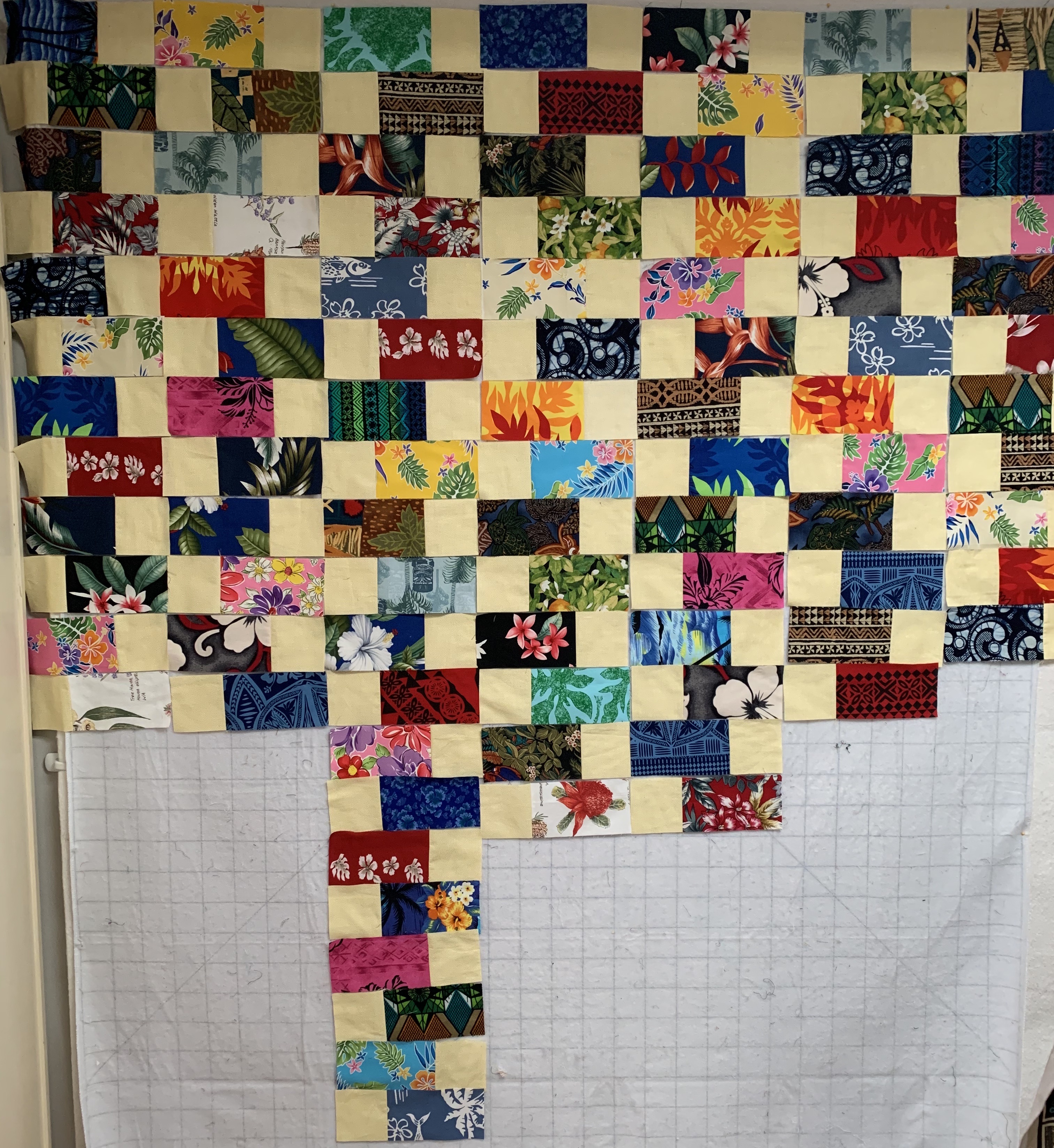 I wanted my quilt to be approximately 60 by 72 inches. I find that to be a good nap quilt size. My blocks are 9 inches wide. So 60 divided by 9 is 6.667. I round up to 7 blocks wide which is 63 inches. A little big, but close enough.