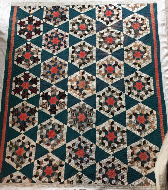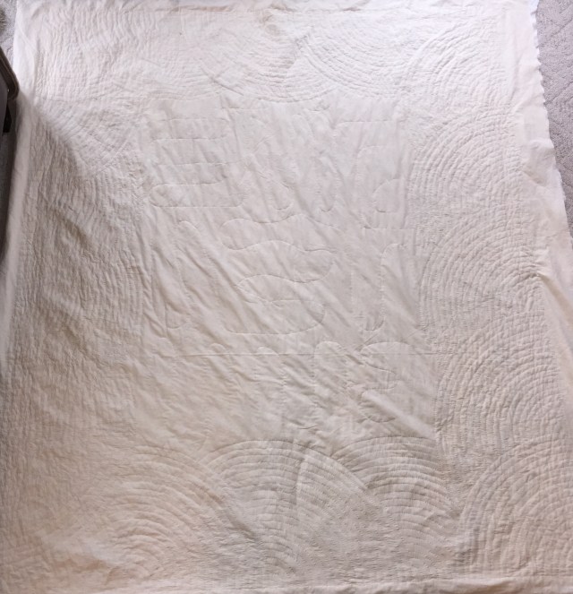 I’ve been slowly working on hand quilting this vintage top and I finally feel like I’m making progress. I’ve done one row of these large fans all the way around the outside edge.