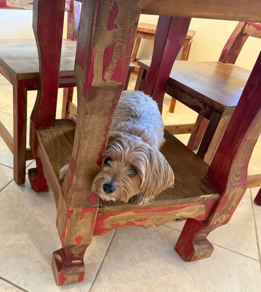 Winslow loves to sit in this spot under our kitchen table.